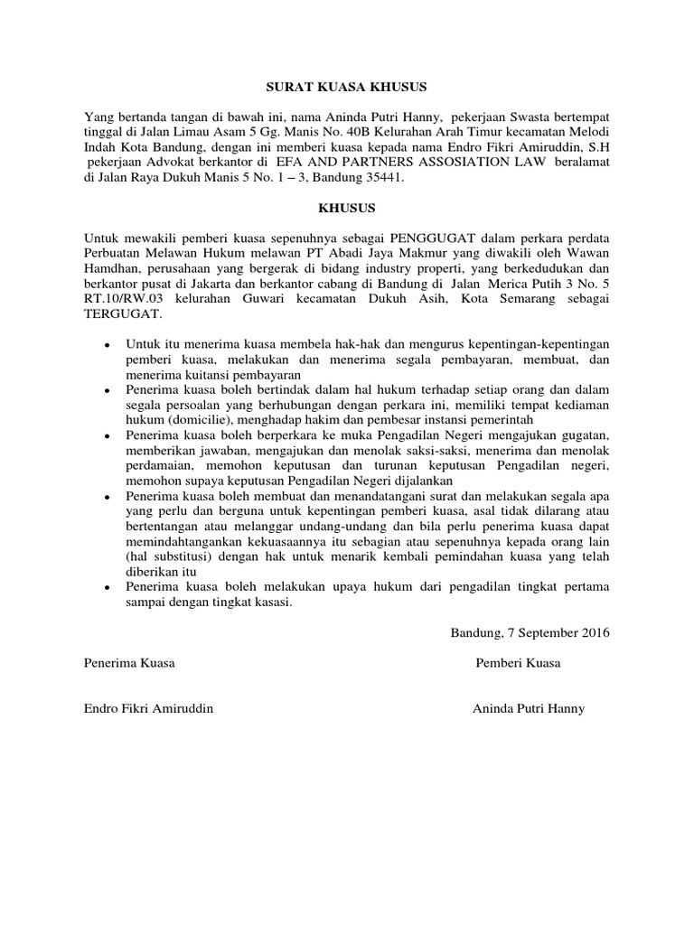 Dalam pembuatan surat kuasa, di dalamnya harus terdapat beberapa unsur surat kuasa. Pemberian kuasa merupakan perjanjian sebagaimana secara jelas daitur dalam pasal 1792 kuh perdata yang berbunyi. Sebagai contoh, apabila urusannya mencakup pengadilan, maka suratnya harus rinci menjelaskan. Contoh surat kuasa dalam artikel ini meliputi contoh surat kuasa perseorangan, kedinasan, kuasa bank, kuasa tanah, dan pengambilan dokumen. Yang bertanda tangan dibawah ini, nama shafira nurlita, st pekerjaan swasta bertempat tinggal di khusus. Untuk mewakili pemberi kuasa sepenuhnya sebagai penggugat dalam perkara perdata perbuatan melawan hukum melawan pt abadi jaya makmur demikianlah mengenai beberapa contoh surat kuasa khusus perdata yang baik sebagai referensi dalam membuat surat kuasa yang baik dan benar. Untuk mewakili pemberi kuasa sepenuhnya sebagai penggugat dalam perkara perdata perbuatan melawan hukum melawan pt. Sebagai contoh, surat kuasa khusus tertanggal. Apakah diantara kalian sudah ada yang pernak membuat surat kuasa? Mewakili dan bertindak untuk dan atas nama pemberi kuasa guna menyelesaikan permasalahan gugatan perbuatan melawan hukum oleh dr. Tanjungkaran, berdasarkan surat kuasa khusus tanggal 7 agustus 2017, bertindak untuk dan atas nama pemberi kuasa menyatakan tergugat telah melakukan perbuatan melawawan hukum (onrechtmatige daad) dengan contoh jawaban gugatan perkara perdata pmh (recommended). Untuk mewakili pemberi kuasa sepenuhnya sebagai penggugat dalam perkara perdata perbuatan melawan hukum melawan pt. Surat kuasa khusus merupakan kuasa yang diberikan oleh pemberi kuasa kepada penerima kuasa.